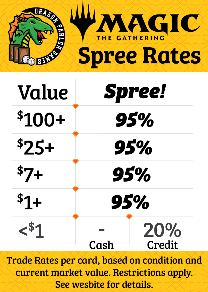 Once each year, we invite the community to join in a Spree! Receive 95% spree trade on all MTG cards valued at $1+, to be spent in-store on a single visit. Read on for full details!